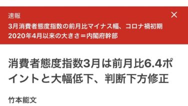嫌儲 3月消費者態度指数33.3(前月比-6.4)と大幅低下。内閣府幹部「コロナ初期級きちゃった」