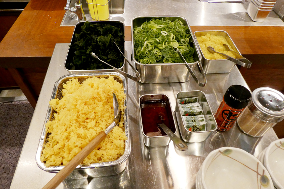 同社では、「青ねぎ」「おろししょうが」「天かす」「香七味」「すりごま」「わさび」といった6種類のトッピングや薬味を無料で提供してきたが、そのラインアップに「わかめ」と「しび辛ラー油」が追加される。