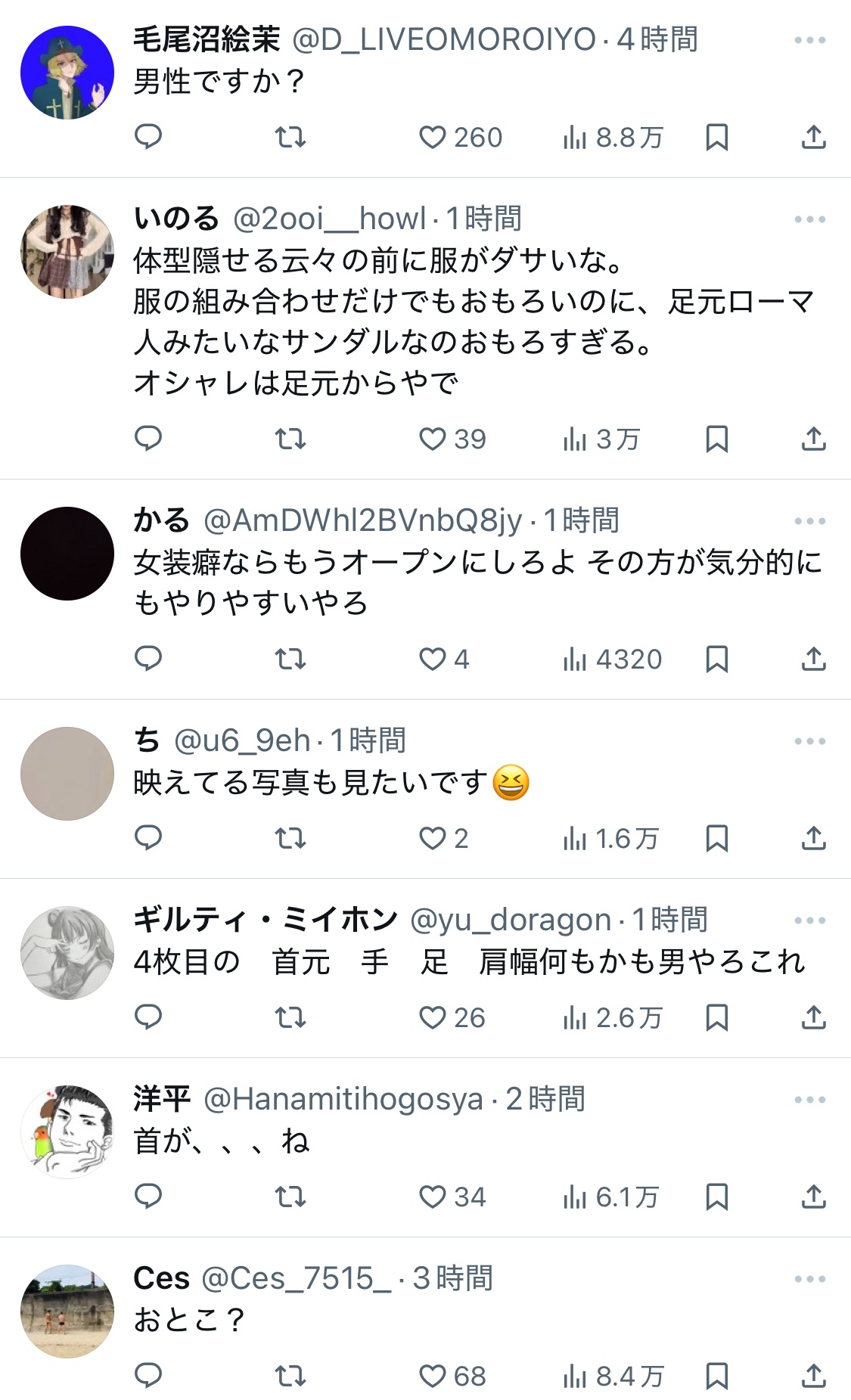 いやひまわり柄のだけが男で本人だ顎にほくろあるし他の女に見える画像は隠し撮りしたやつ