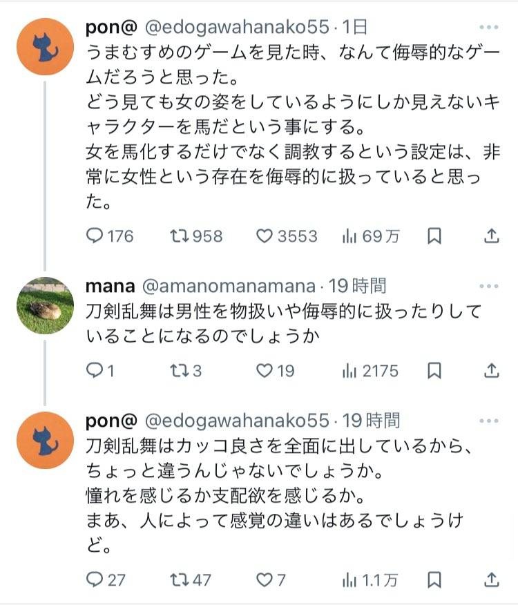 ウマ娘とかおぱーい揺らして走って性的搾取してるものと刀剣乱舞でかっこいいのを見てね ってやってるものは違うだろ