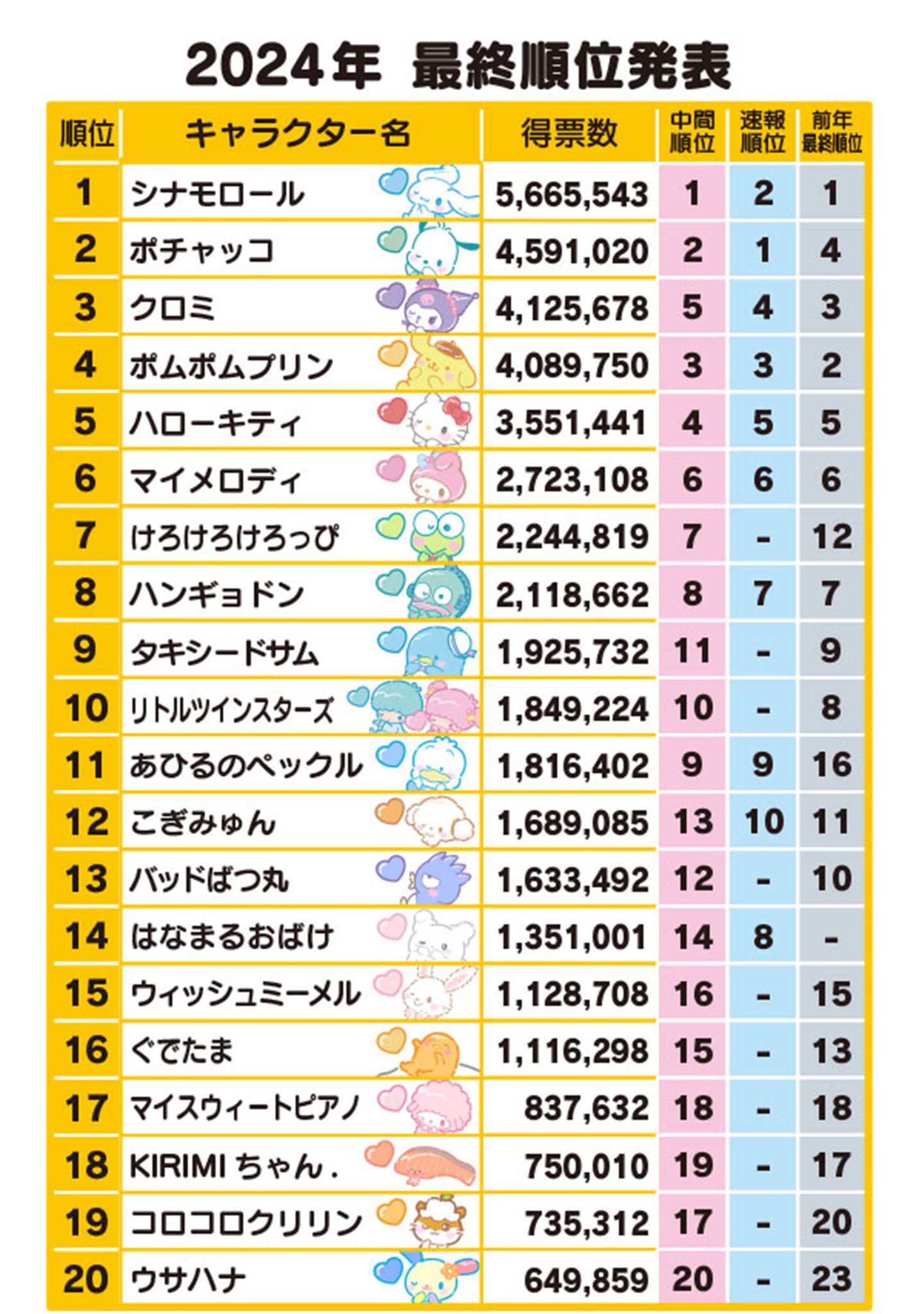 サンリオキャラクターの人気投票イベント「2025年サンリオキャラクター大賞」の初回速報順位が、10位まで発表された。