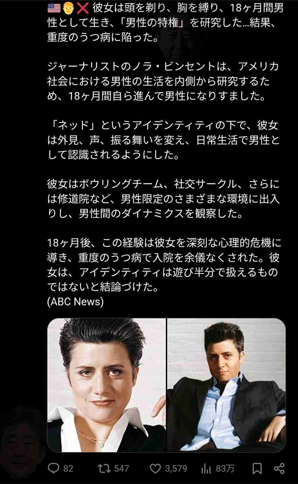 👩「何よ!男になりすまして男の特権について研究するわよ!」👉うつ病になってしまう