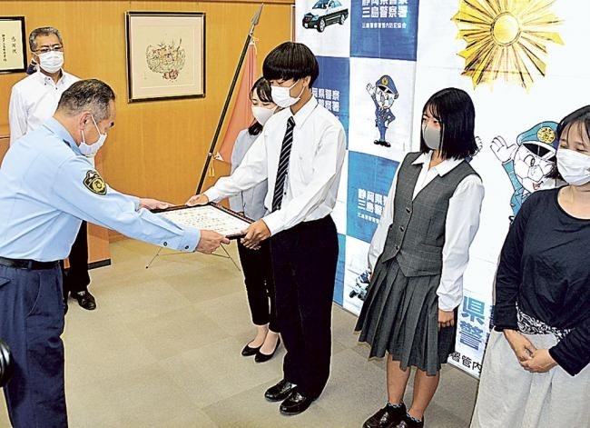 - 三島署は二日、三島市内で橋から飛び降り自殺をしようとした県外の二十代男性を説得、命を救ったとして、県立伊豆総合高校三年の川畑和也さん(17)=同市=と県立田方農業高校三年の川田玲さん(17)=同=に感謝状を贈った。