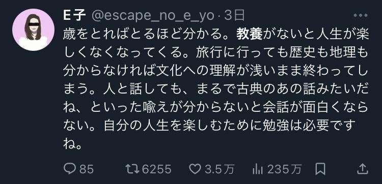 「歳をとればとるほど教養がないと人生を楽しめなくなる」嫌儲民の人生がつまらない理由ってこれだよな…