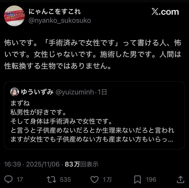 👤「私は手術済なので女性です」👩🦰「イヤアアアアア!!それは女じゃなくて『手術した男』なのおおおお!!」