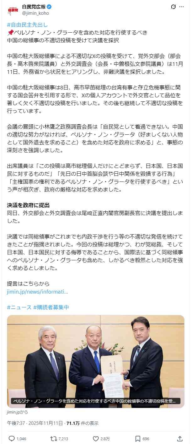 【サナ悲報】自民党「ペルソナ・ノン・グラータを含めた対応を行使するべき」中国の総領事の不適切投稿を受けて決議を採択