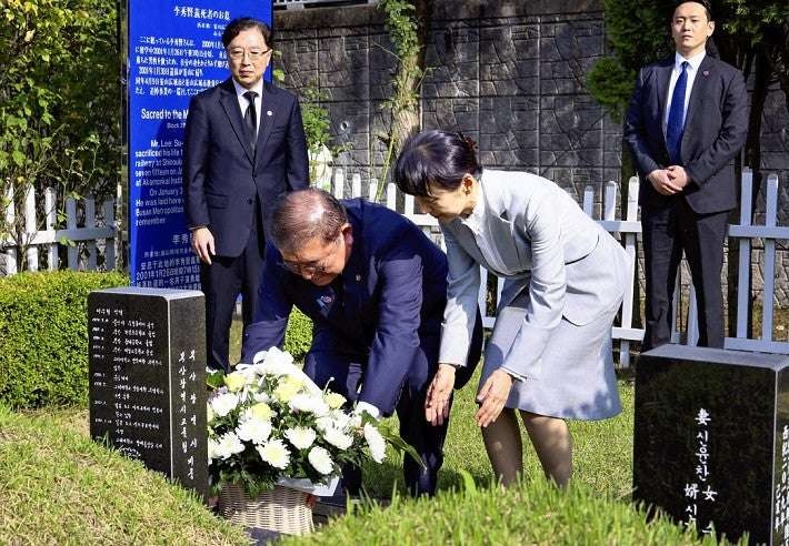 石破首相、新大久保駅事故で犠牲の韓国人留学生の墓前で手合わせる…韓国南部・釜山