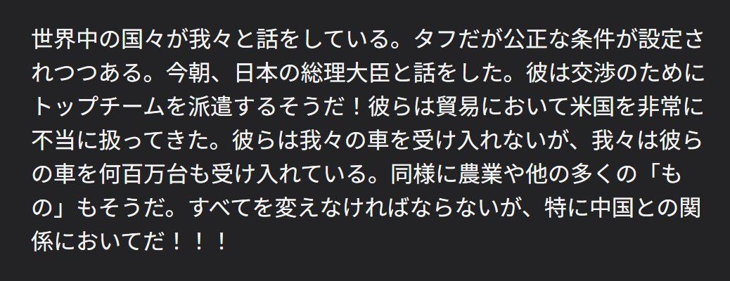 交渉チームが中国離れをもってくるなら緩和するという意味やろ - 14 : 2025/04/07(月) 23:22:42.437 ID:HLyd5ArFZ