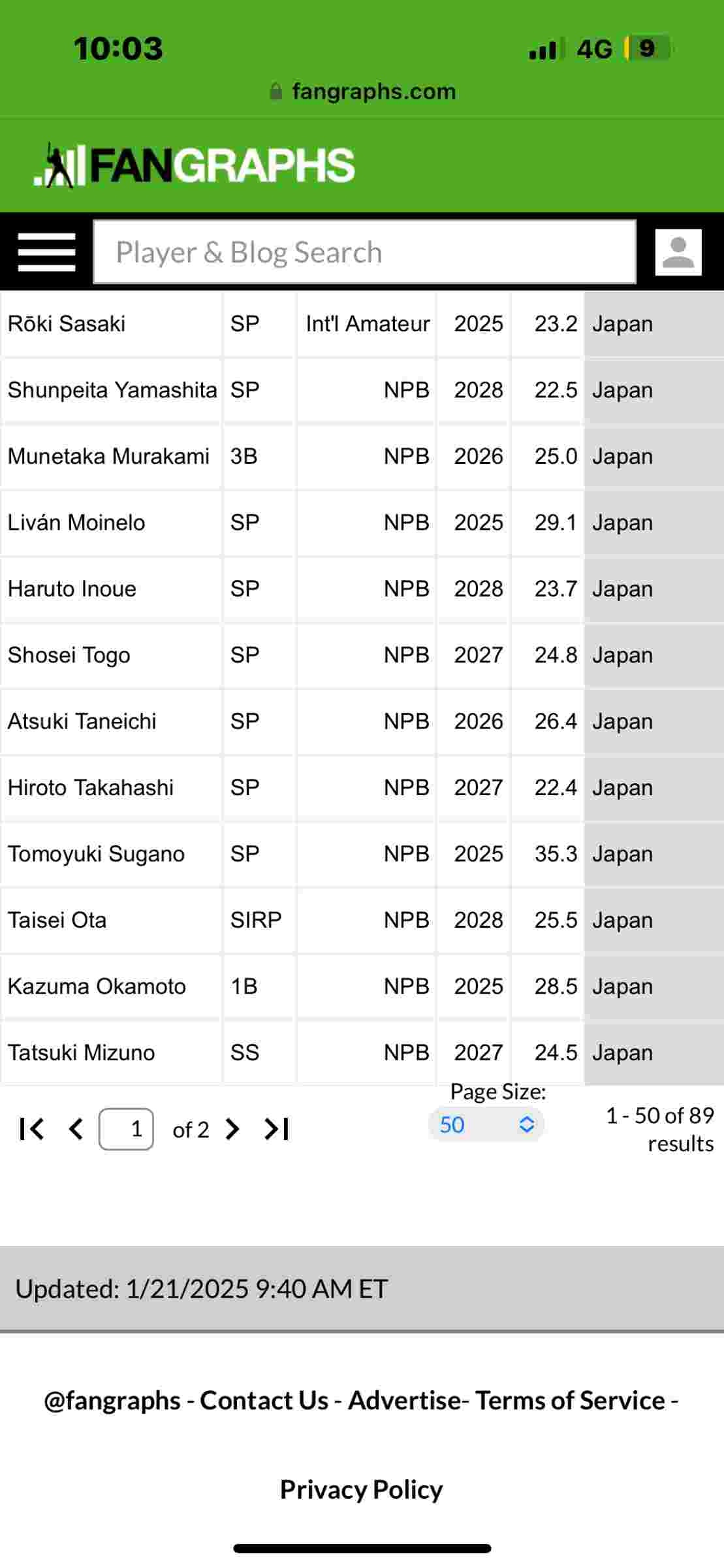 - Fangraphs、国際プロスペクト日本人選手ランキングTOP10