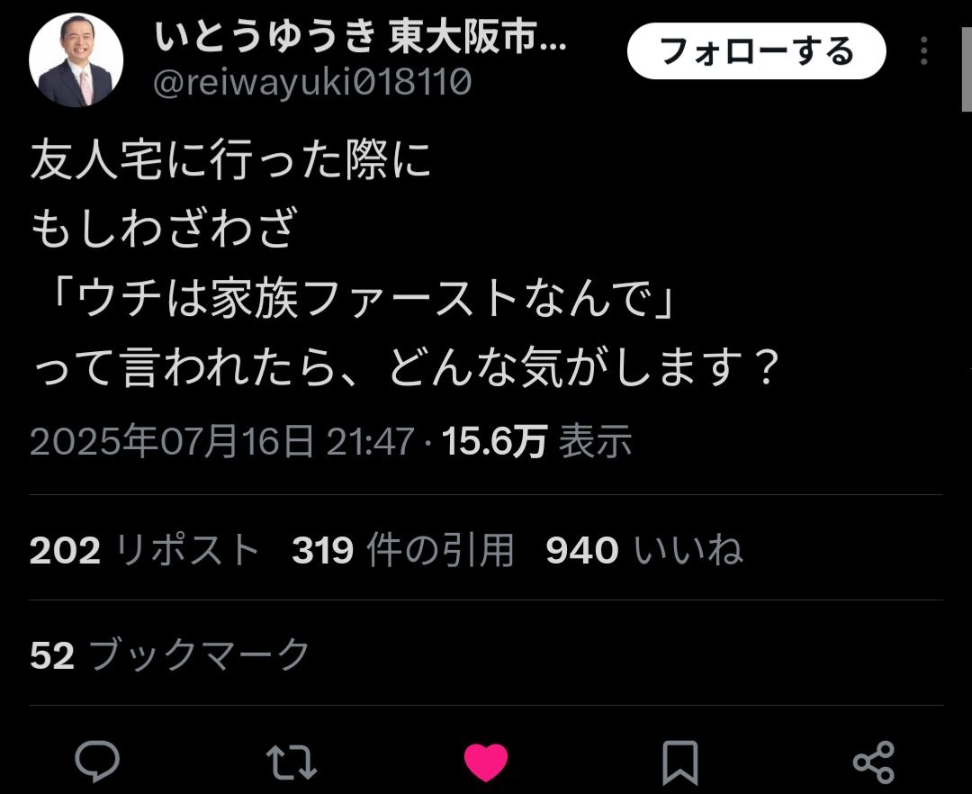 家族優先とか同じようなニュアンスのことを言う人多いだろ - 81 : 2025/07/17(木) 12:42:27.87 ID:0kEbZ8kr0