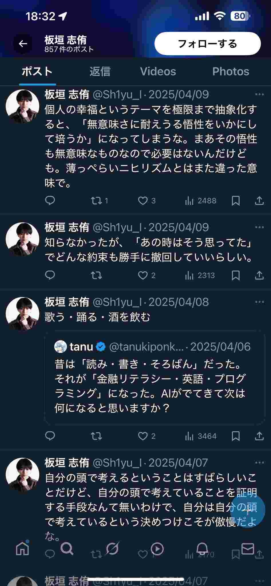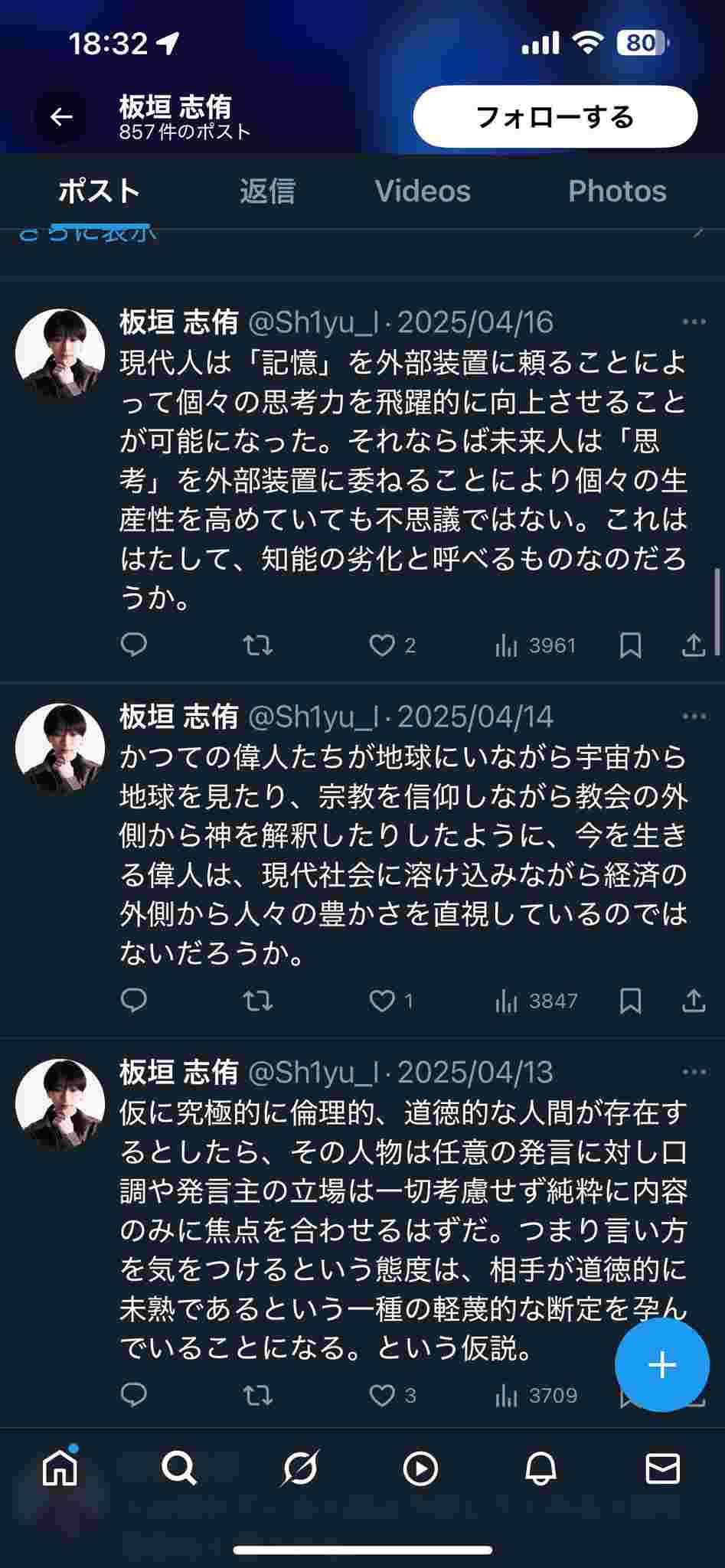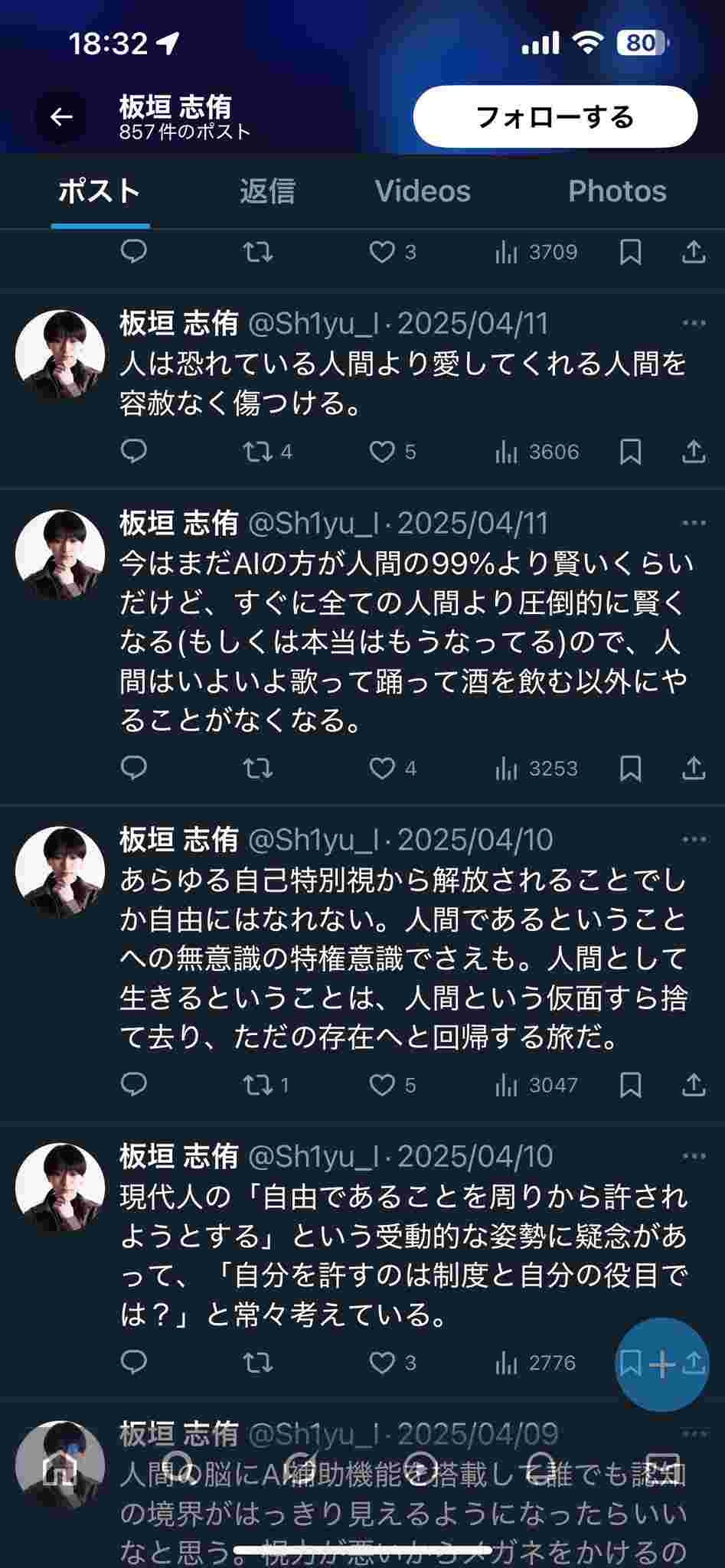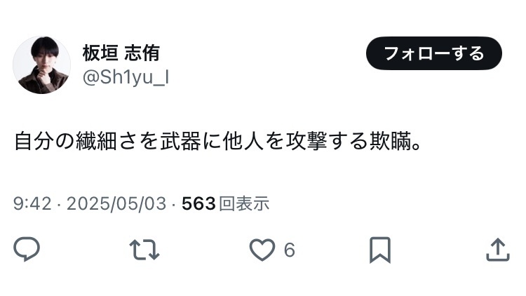 毎回こいつの謎の意識高い系ポストと紐付けられるの草 - 36 : 2025/05/03(土) 19:50:27.336 ID:SEtF1yNjB