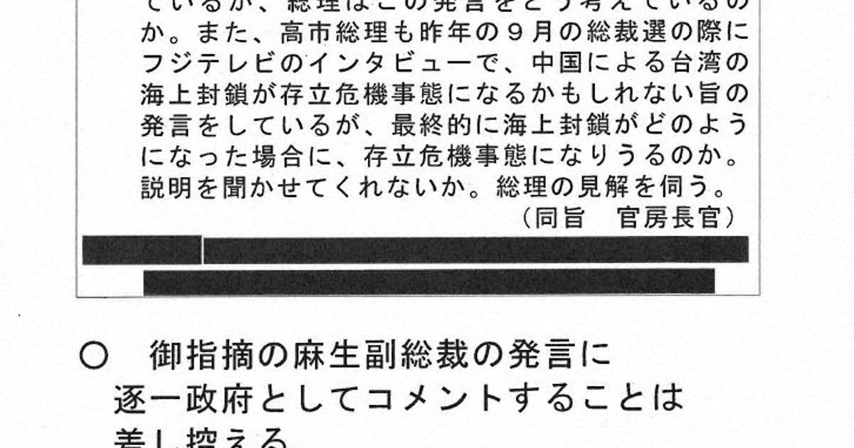 高市早苗首相が11月7日、台湾有事について「存立危機事態になり得る」と国会で答弁した際、内閣官房が作成していた首相の答弁資料の全容が判明した。資料には首相答弁に該当する部分は存在せず、台湾有事について「政府として答えない」とも明記されていたが、「答弁書通り」の発言にはならなかった。