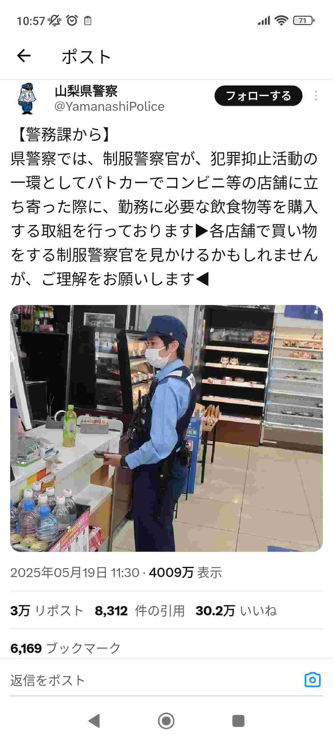 【画像】山梨県警さん、警邏中にコンビニで買い物したらクレーム89件来たからご理解ください(´;ω;`)