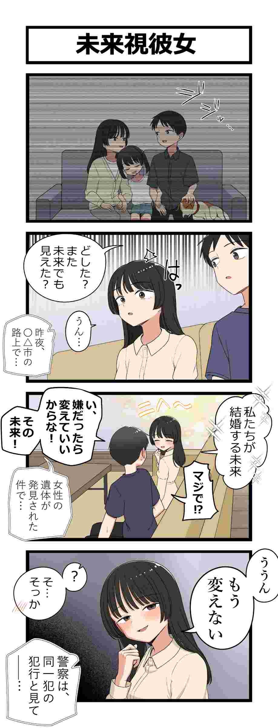 彼ピに気がある女2人殺して未来視でちゃんと自分が結婚して子供もいる望んだ未来になってるよかったぁ・・