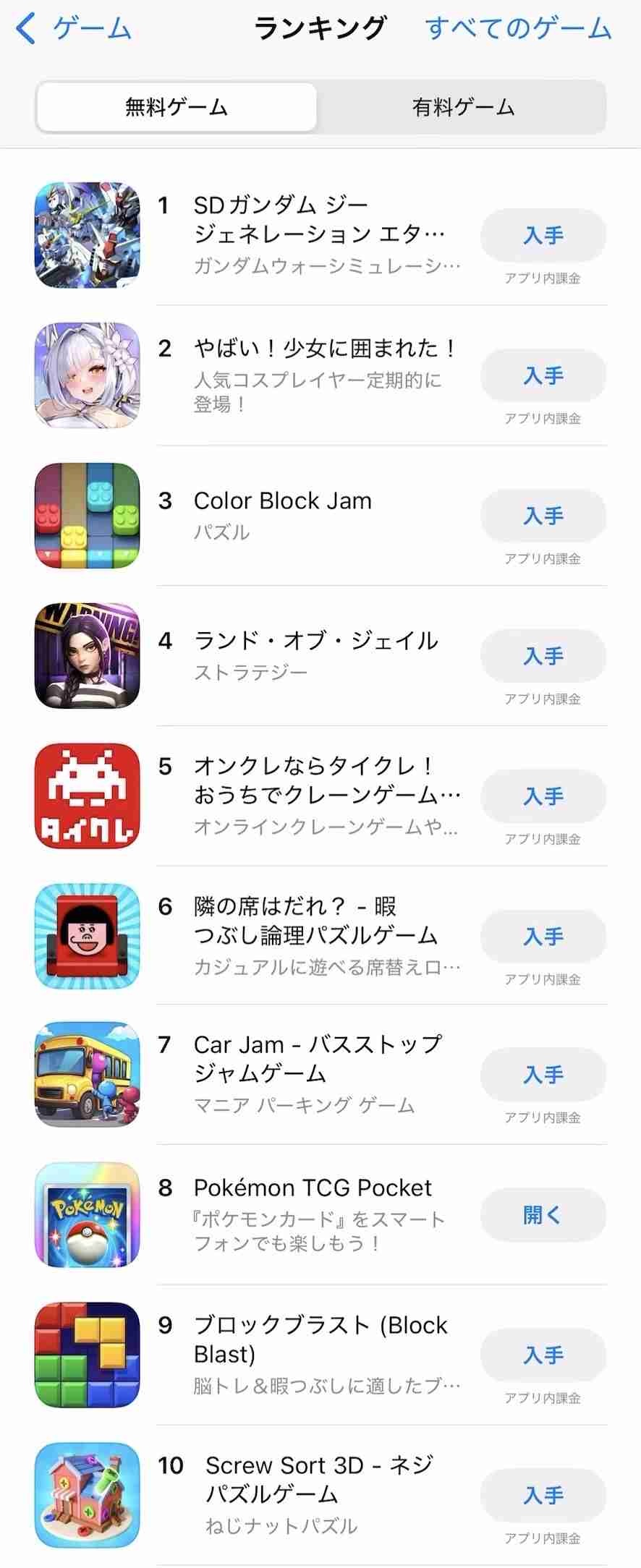 【画像】AppStoreの人気ゲームランキング、ポケポケが「8位」へ。「1位」は意外なあのゲームwww