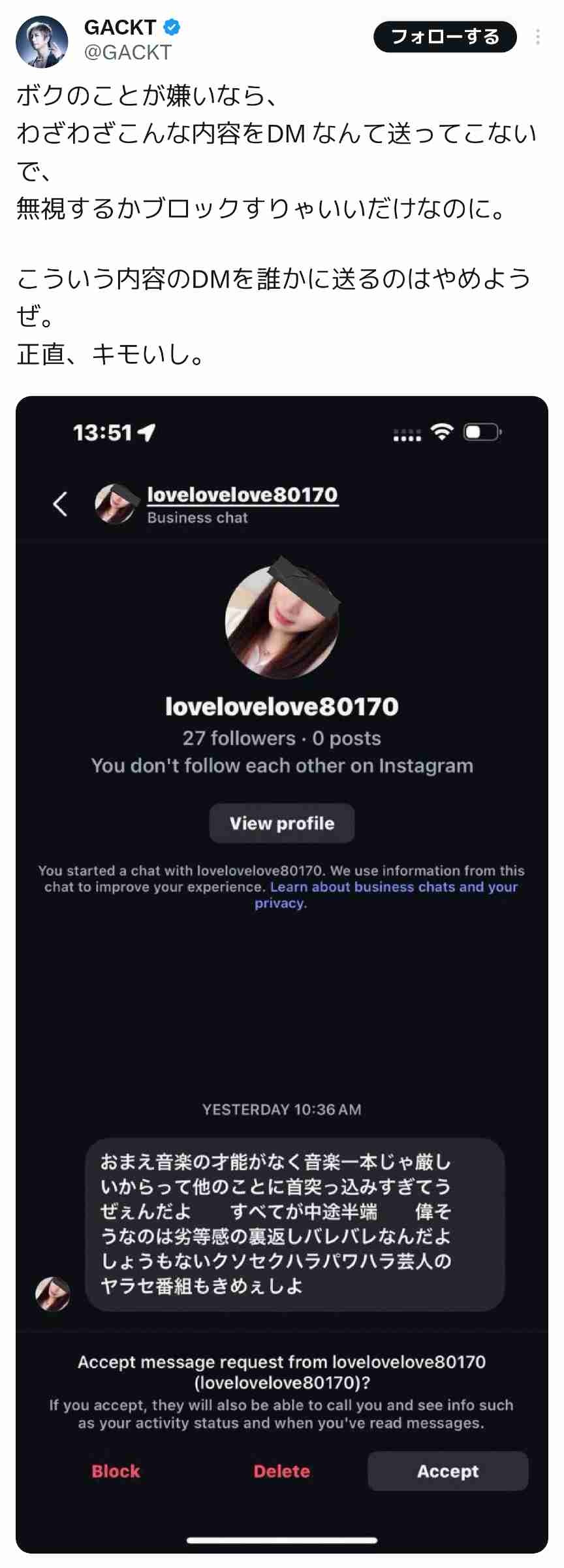 【画像】GACKTさん、誹謗中傷相手を晒して公開処刑www