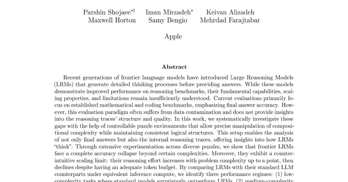 The Illusion of Thinking: Understanding the Strengths and Limitations of Reasoning Models via the Lens of Problem Complexity – Apple Machine Learning Research