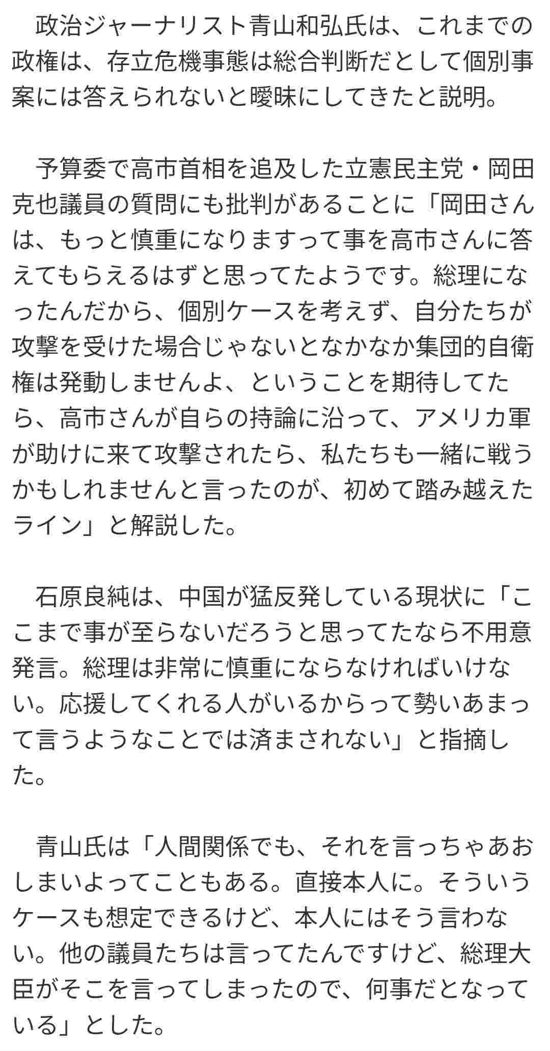 - 政治ジャーナリスト青山和弘氏は、これまでの政権は、存立危機事態は総合判断だとして個別事案には答えられないと曖昧にしてきたと説明。
