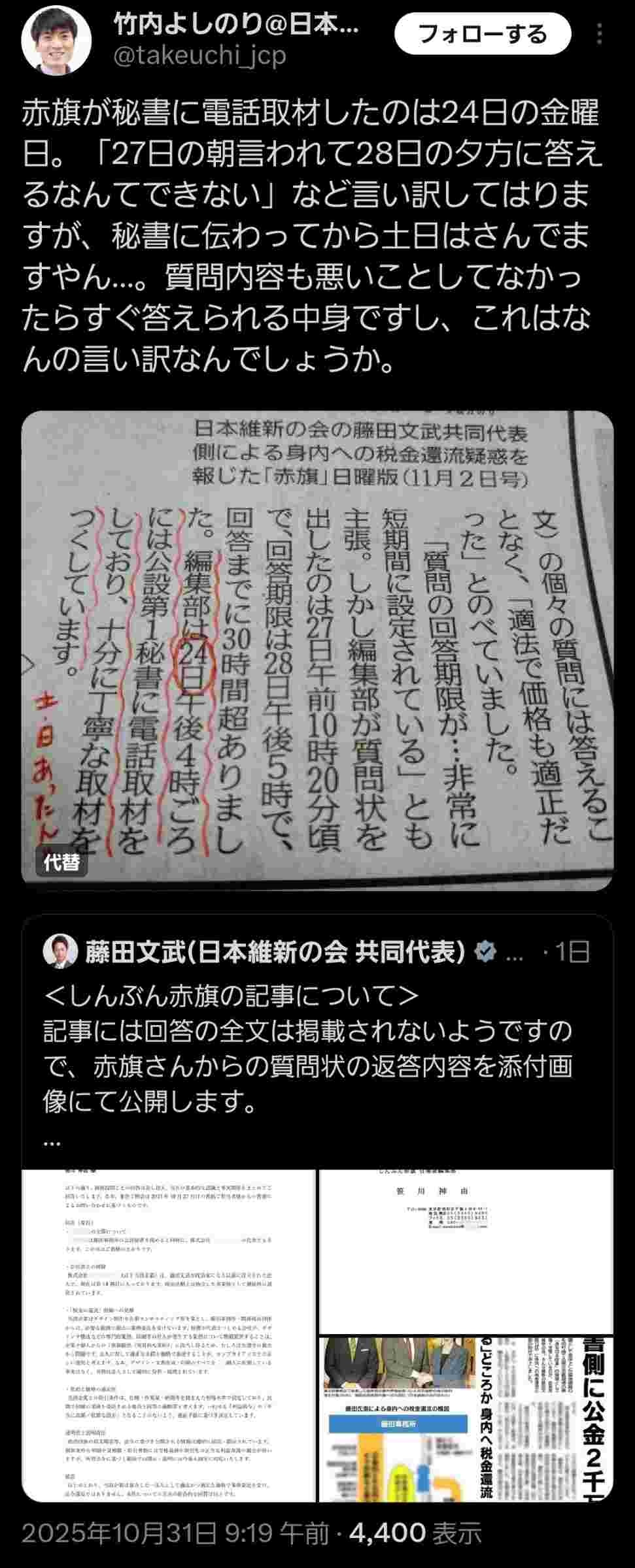 【高市悲報】維新藤田「回答1日でしろとか赤旗は卑怯や😡」赤旗「いや先週から取材してますやん😅」