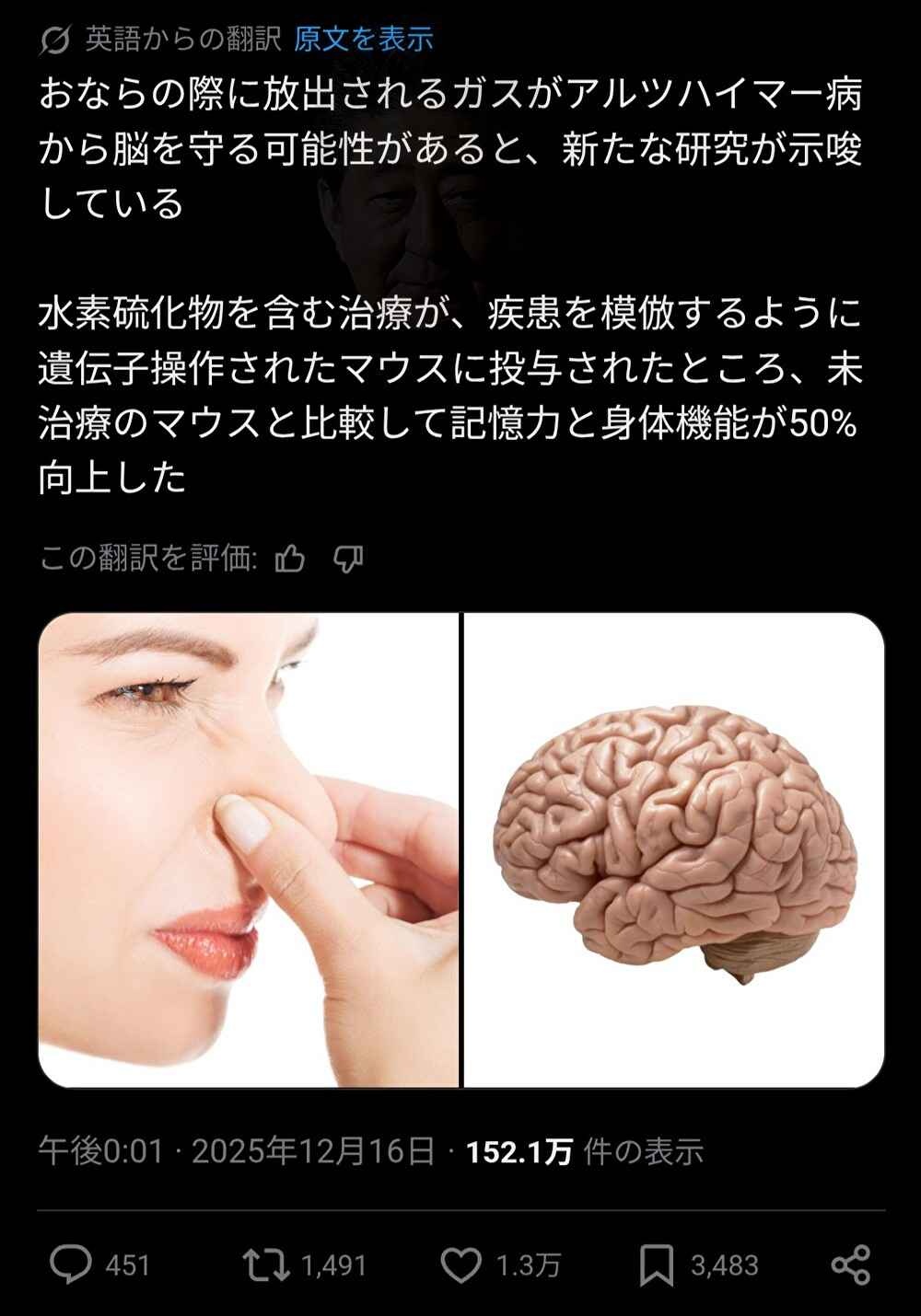 【高市朗報】「おなら(ガス)」がアルツハイマーから脳を守る可能性(´;ω;`)