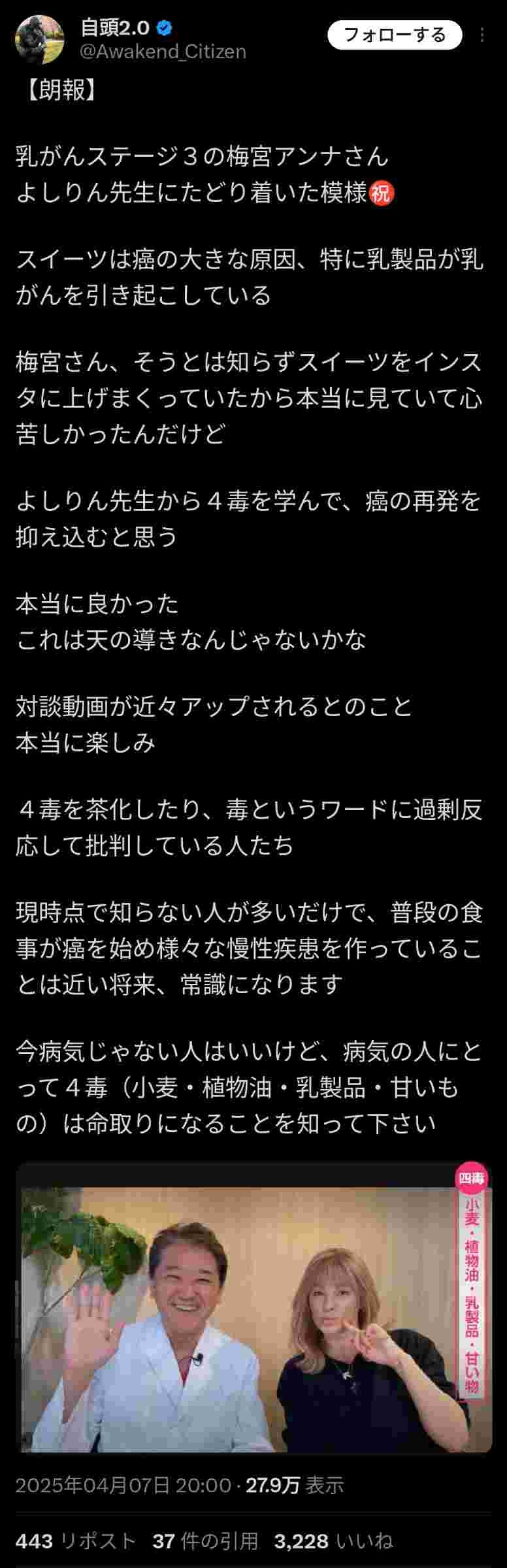 がんステージ3の梅宮アンナ、有名インチキ歯医者に辿り着いてしまい終わる