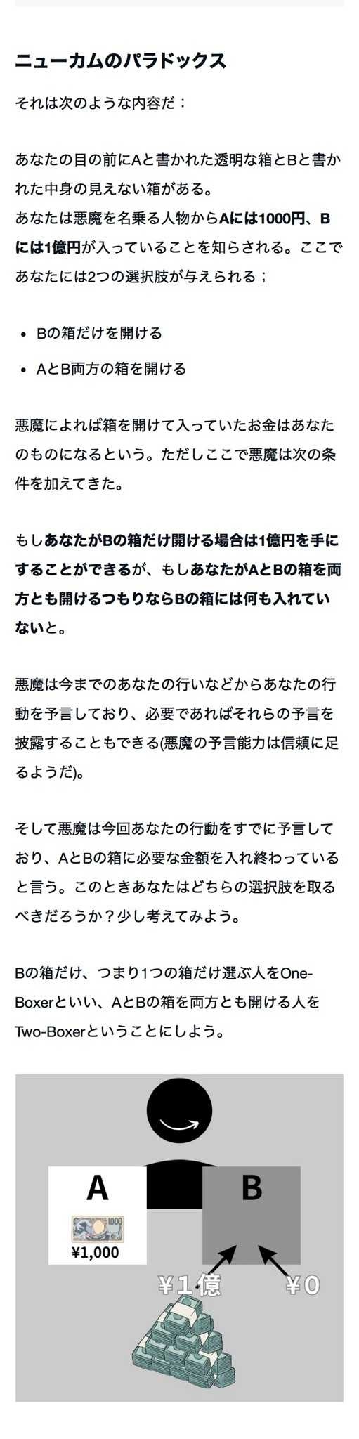 あなたの目の前にAと書かれた透明な箱とBと書かれた中身の見えない箱がある。