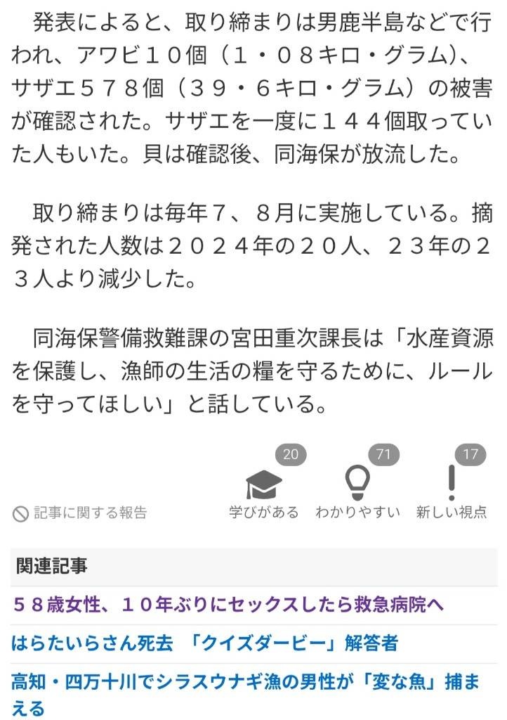 すまん、アワビ密漁のニュースの関連記事が「58歳女性、10年ぶりにセクロスしたら救急病院へ」な理由を教えてくれ