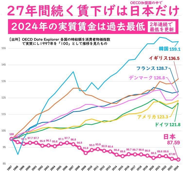 これみればわかるけど日本人が貧しい理由は賃金が上がらないからなんだよね