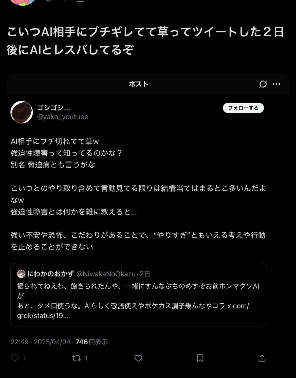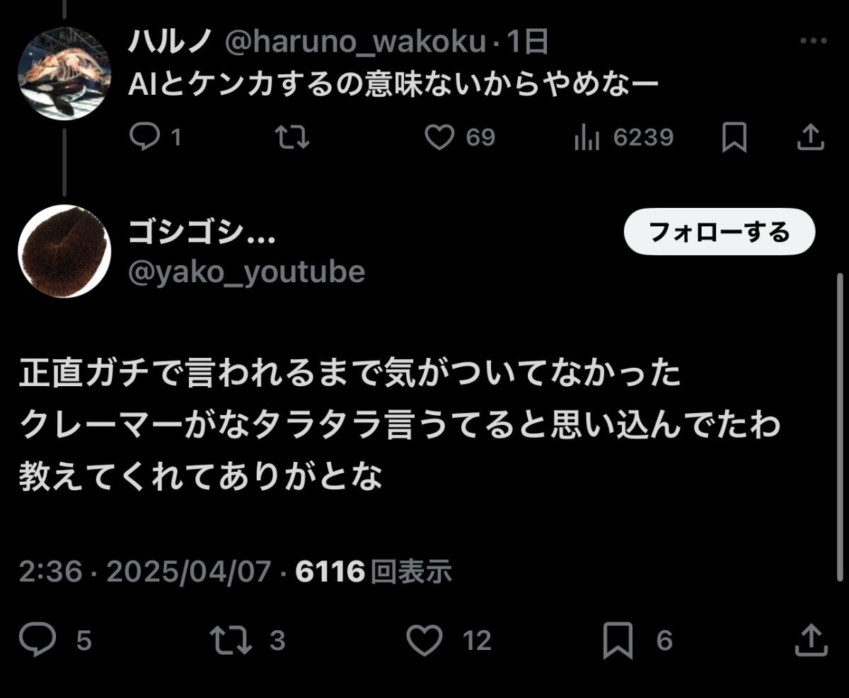 「その人AIですよ」と指摘され、そこで初めてレスバ相手がAIだと気付く - 13 : 2025/04/08(火) 16:53:19.832 ID:LCjPOlXeq
