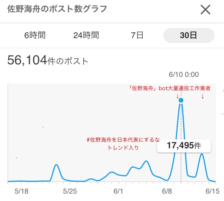 ちなみに、6月10日の試合の当日と前日にも、同様にbotで大量連投工作され、「佐野海舟」が検索できなくなっていた