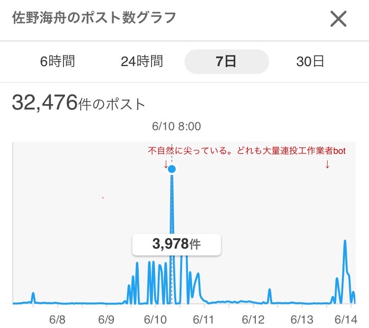 人間の投稿数を遥かに上回る不自然なbotポストの投稿量と不自然な動き