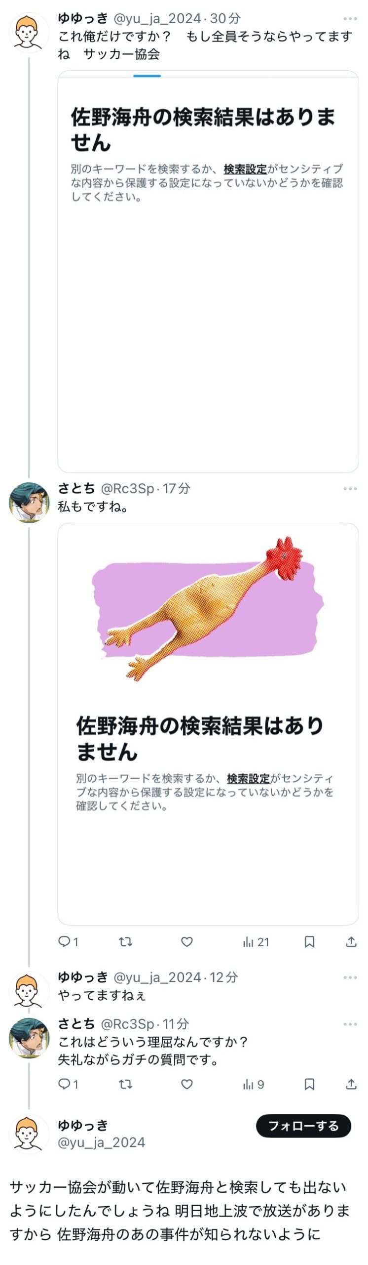 また佐野海舟が検索できず…連投工作業者を雇い言論統制と印象操作?観戦チケ発売前日当日に #サッカー