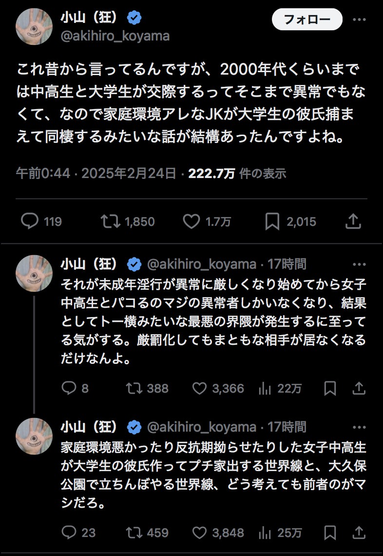 わかり手「大学生が中高生と交際も普通だったのに、それは異常者って風潮にした結果、まともな人がいなくなりガチ異常者だけ残った