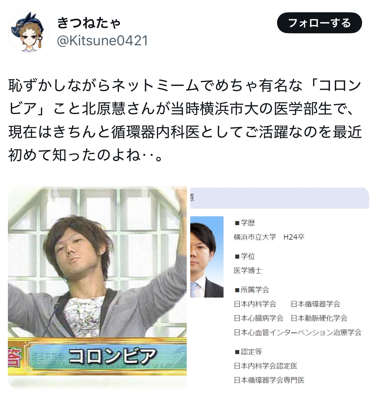 アタック25「コロンビア」ポーズのミームでお馴染みのドヤ顔男、医者になっていた