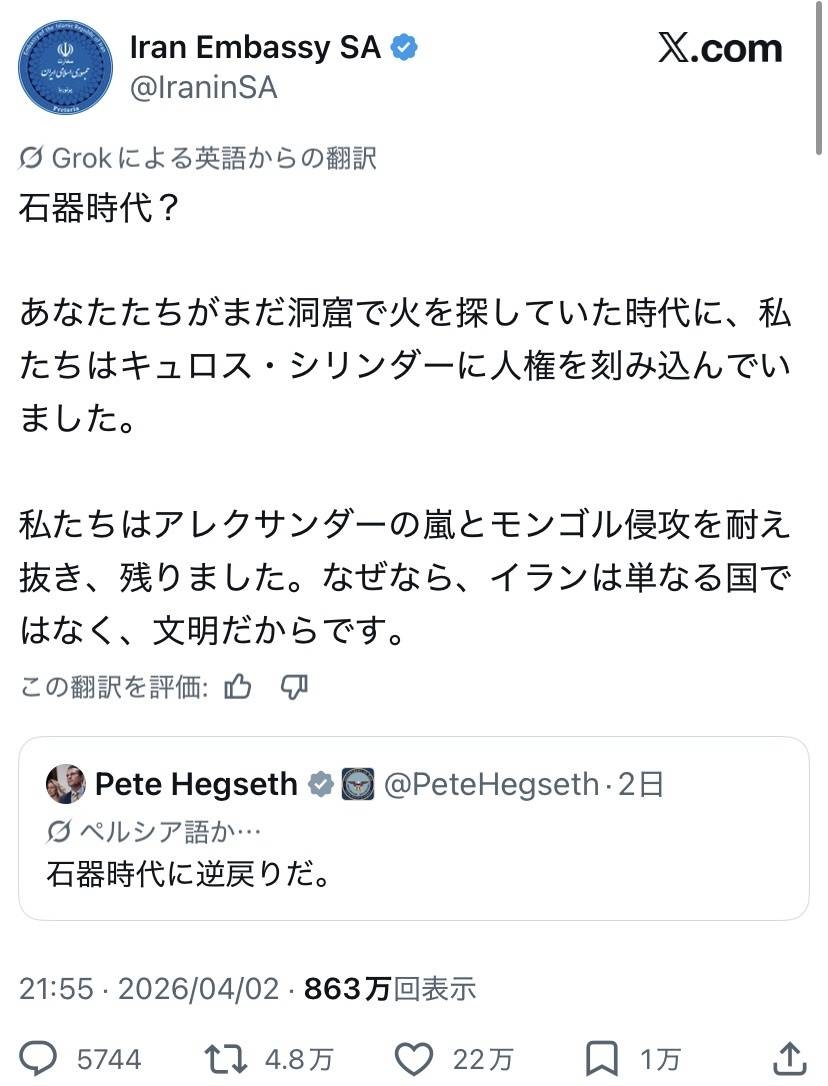 一応イランもはるか昔のペルシャの別名から取られた由緒ある名なんだがな - 109 : 2026/04/04(土) 21:21:07.17 ID:rbOd6SB/00404
