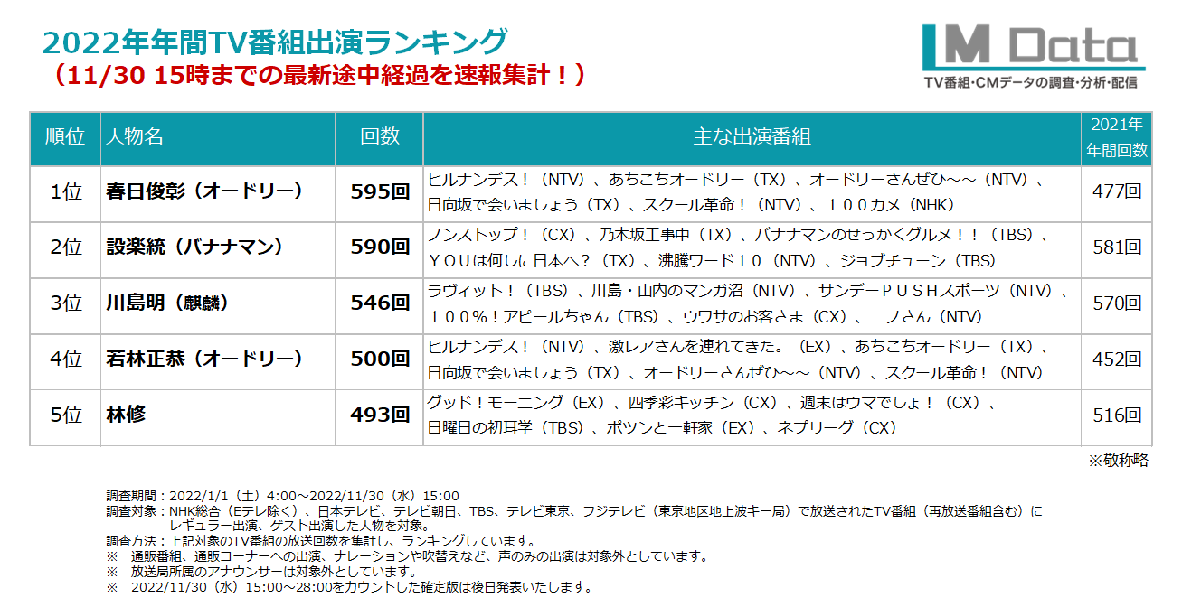 2022年年間テレビ番組出演本数ランキング(11/30 15時までの最新途中経過を速報集計!)