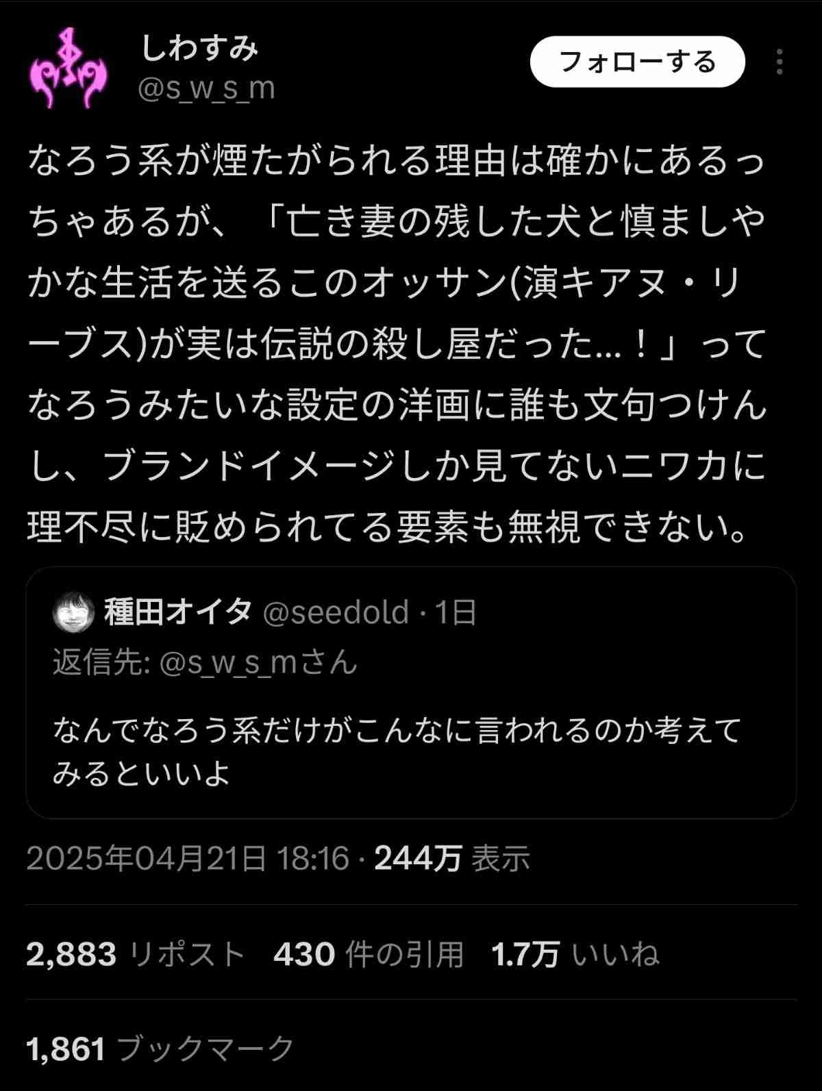 - キアヌリーブスやったらなろうではないけどMrノーバディみたいなうだつの上がらないオッサン無双ものはなろう認定でいい