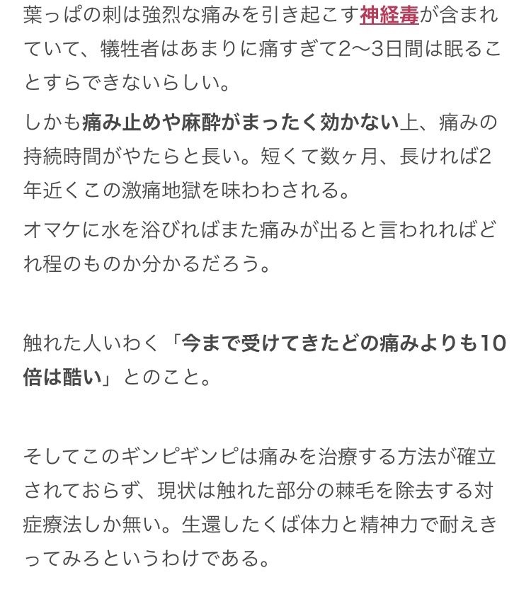 - ・特有の毒素があり酸で焼かれて同時に感電するような激痛