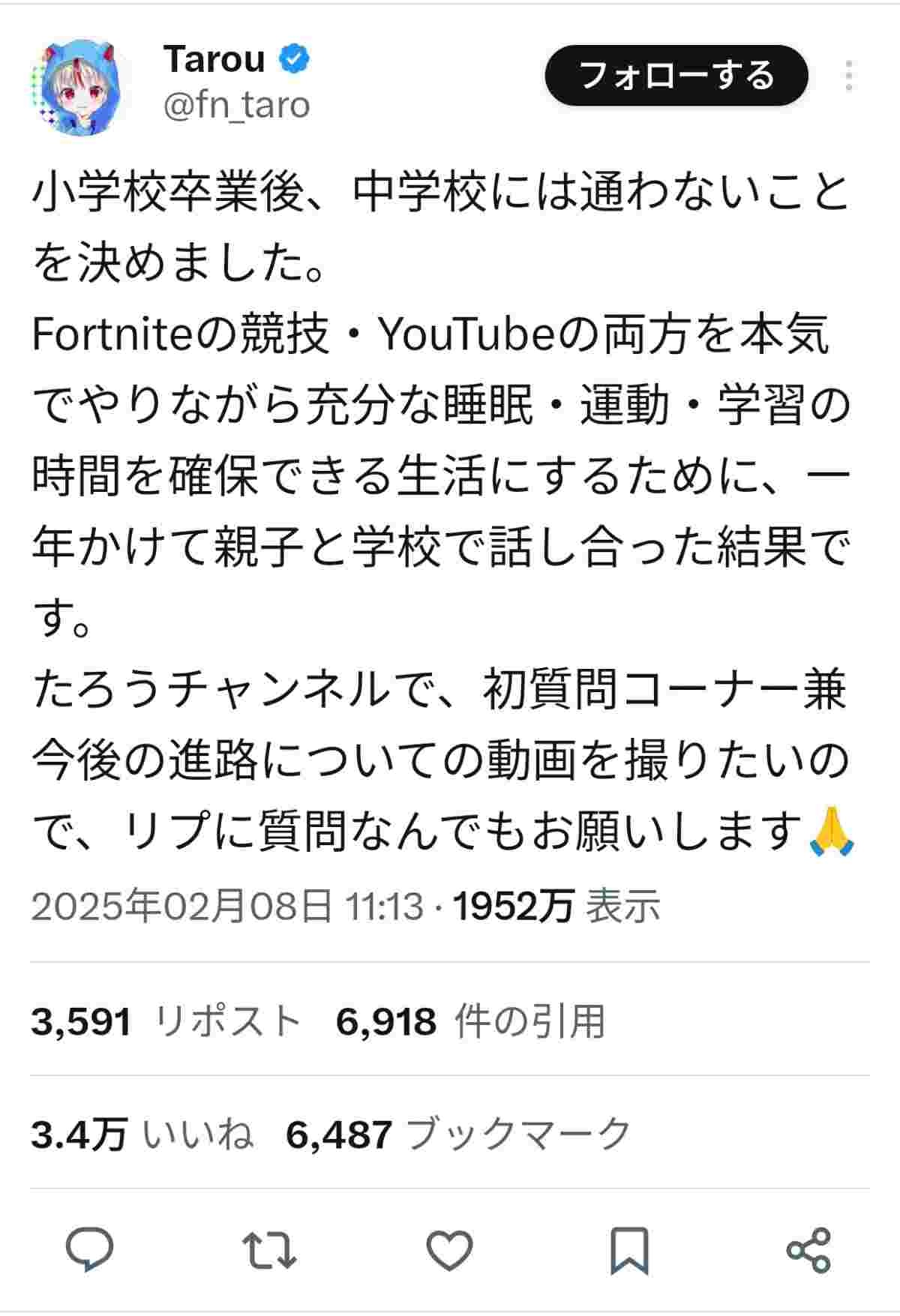 ゲーム系12歳小学生YouTuberさん、学校と協議の結果「小学校卒業後、中学校には通わない」との結論に達する
