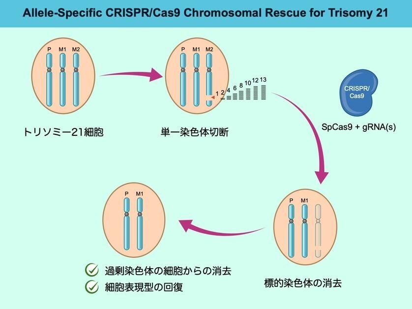 研究グループは、ゲノム編集技術CRISPR-Cas9を用いて、3本ある21番染色体のうち特定の1本を狙い撃ちし、最大37.5%の頻度で過剰な染色体を除去することに成功しました。