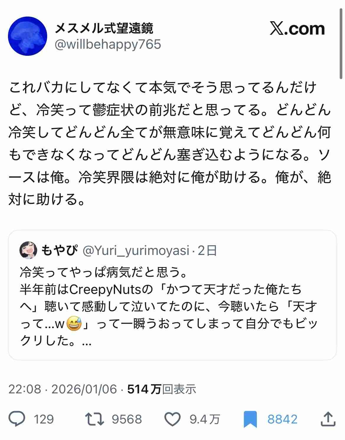 ツイッタラー「冷笑は鬱症状の前兆。どんどん全てが無価値になり生きてる意味がわからなくなる。」