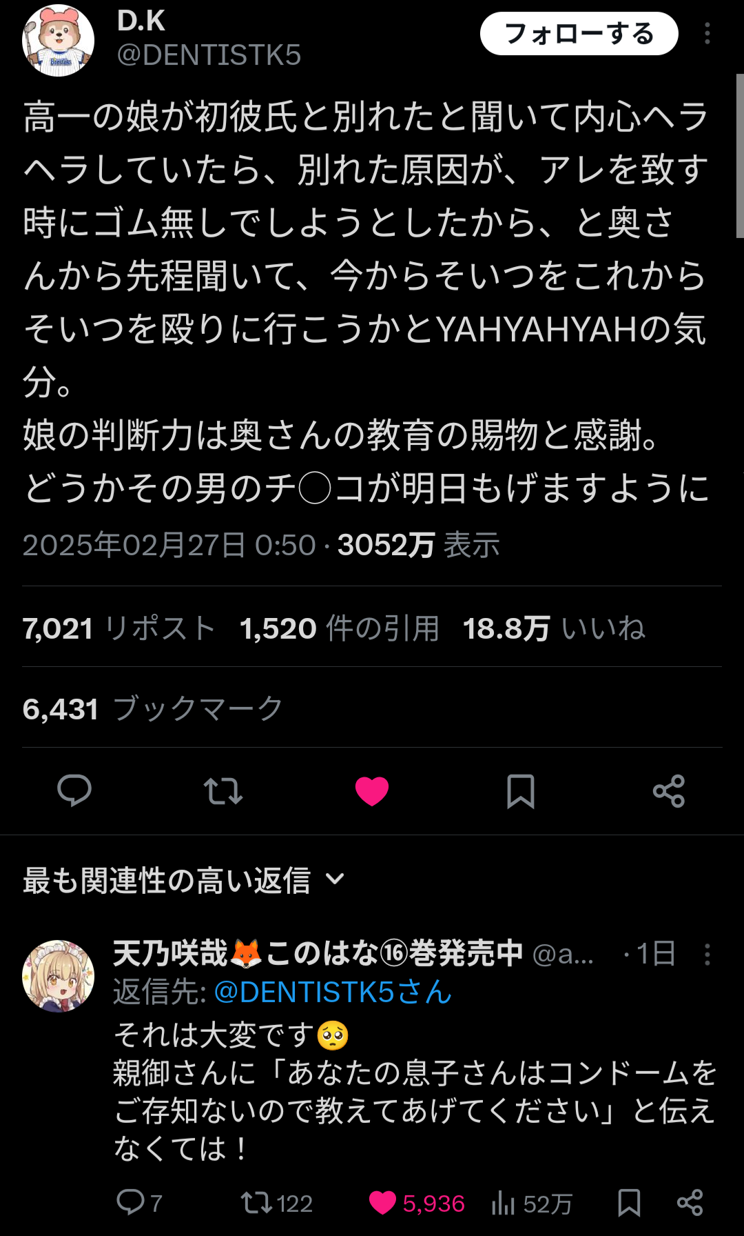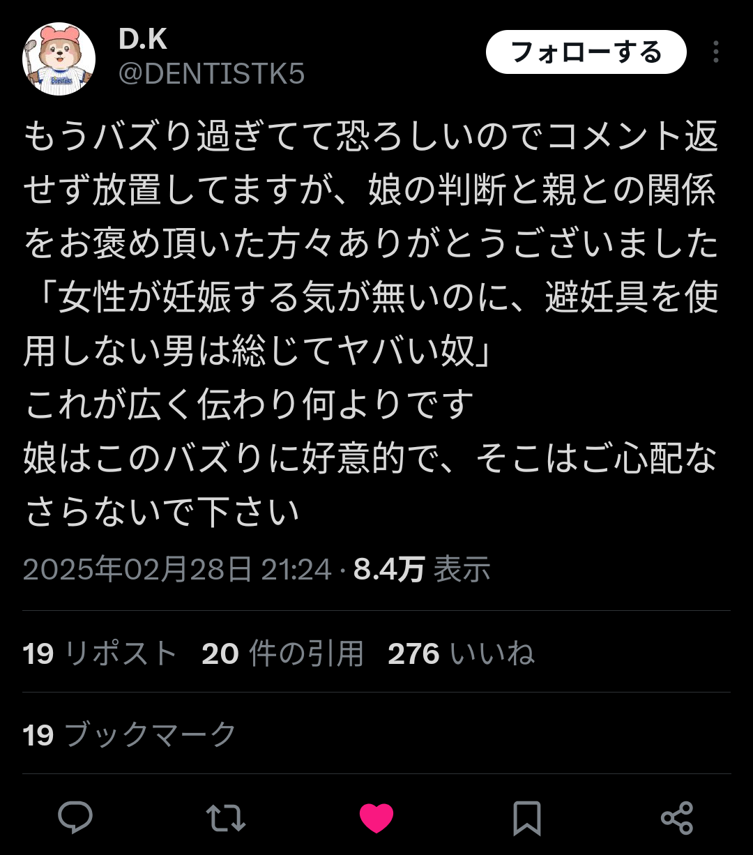 ツイ民「高1娘が彼氏と別れた理由を奥さんに聞きただしたら避妊具を男が拒否したからだと…今すぐ殴りにいきてぇ」20万いいね