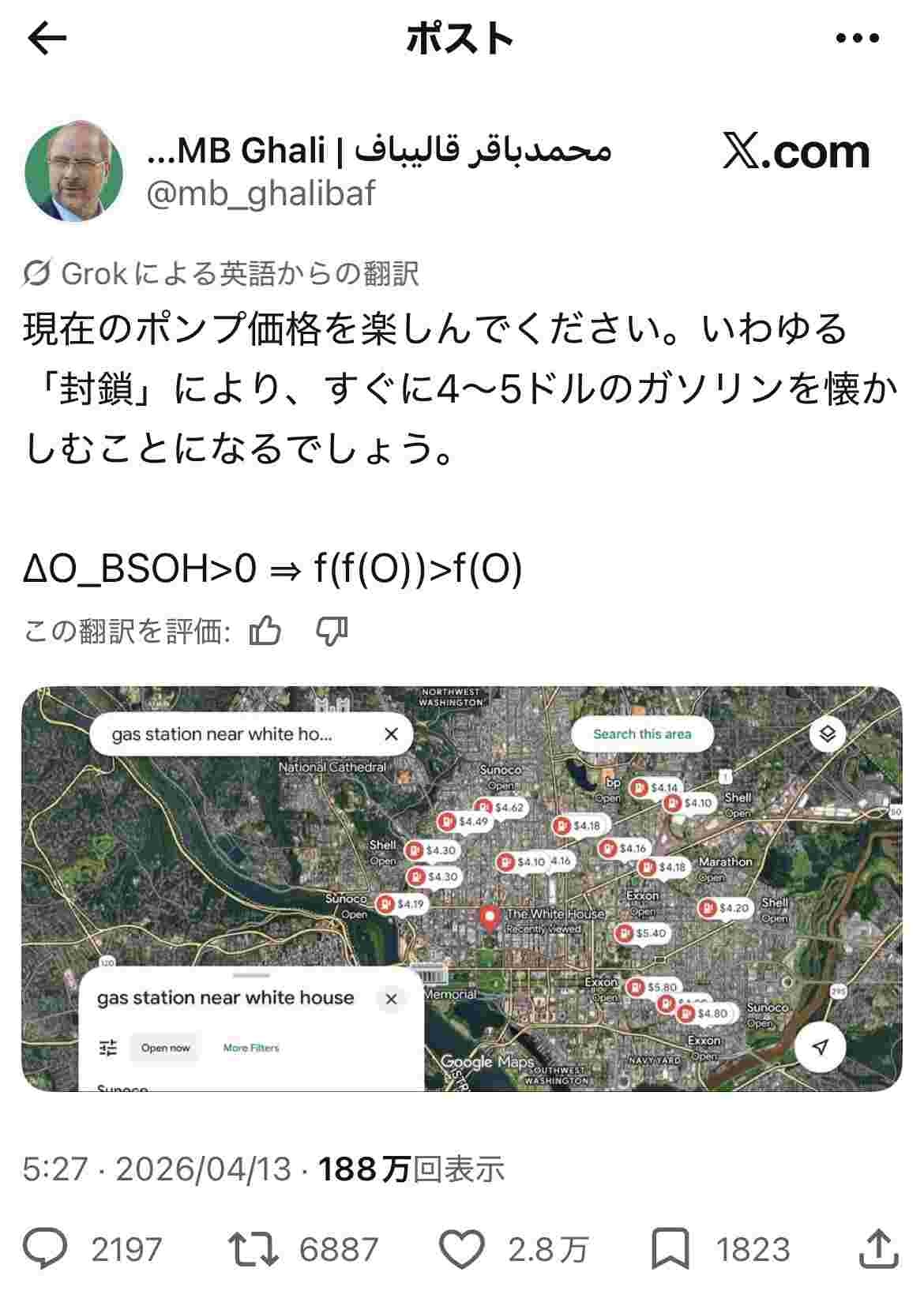 トランプ大統領、ホルムズ海峡封鎖を宣言した結果イランの国会議長に「すぐに上がるから今の安いガソリン価格楽しめ」と煽られる