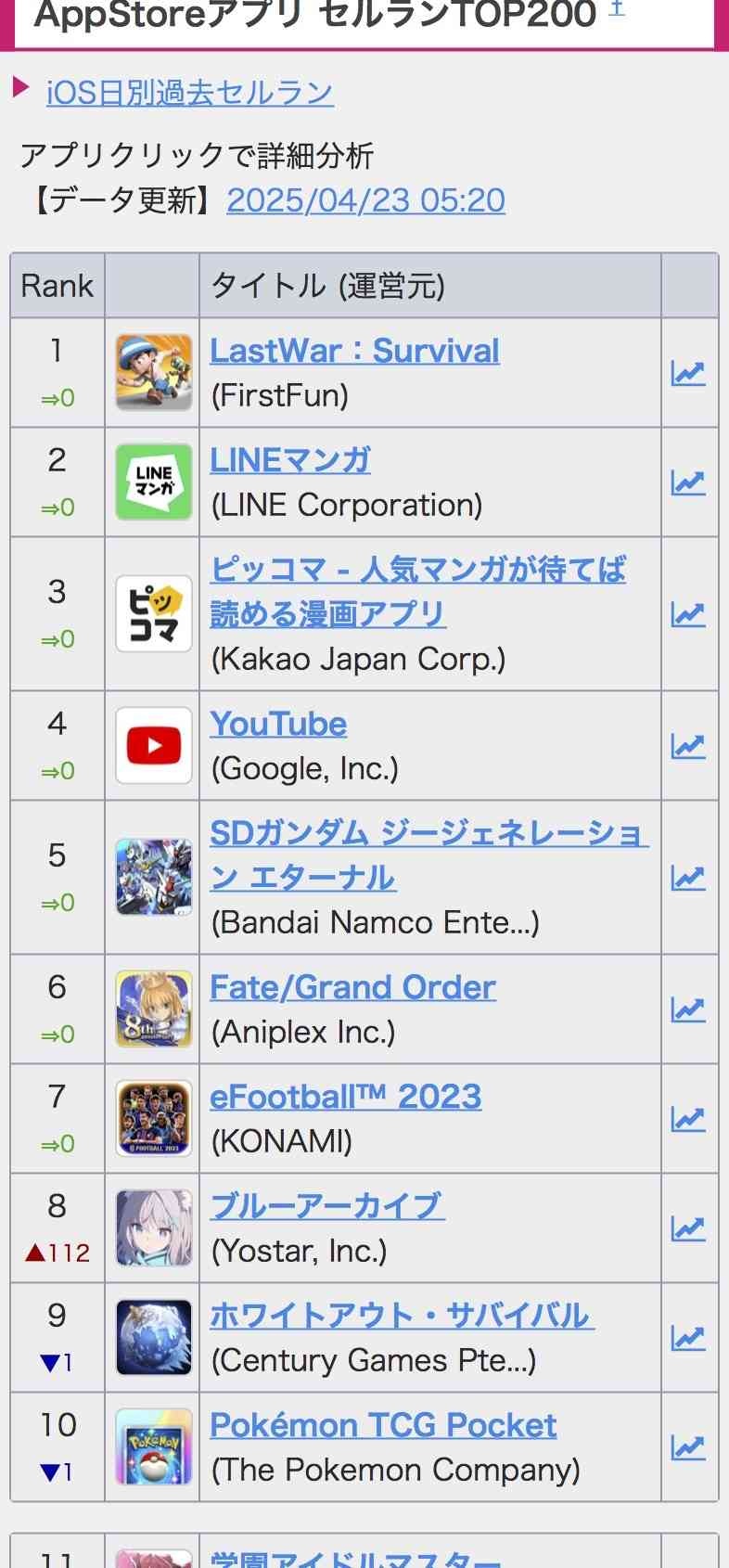 - ブルアカはヨースターと利益折半だから実質20位ぐらいじゃね?