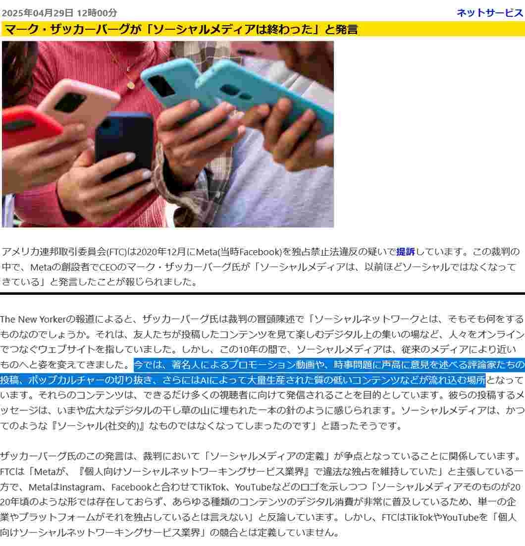 マーク・ザッカーバーグ「SNSは終わった。今や宣伝広告、質の低いAIや政治議論、素人の炎上動画ばかり」