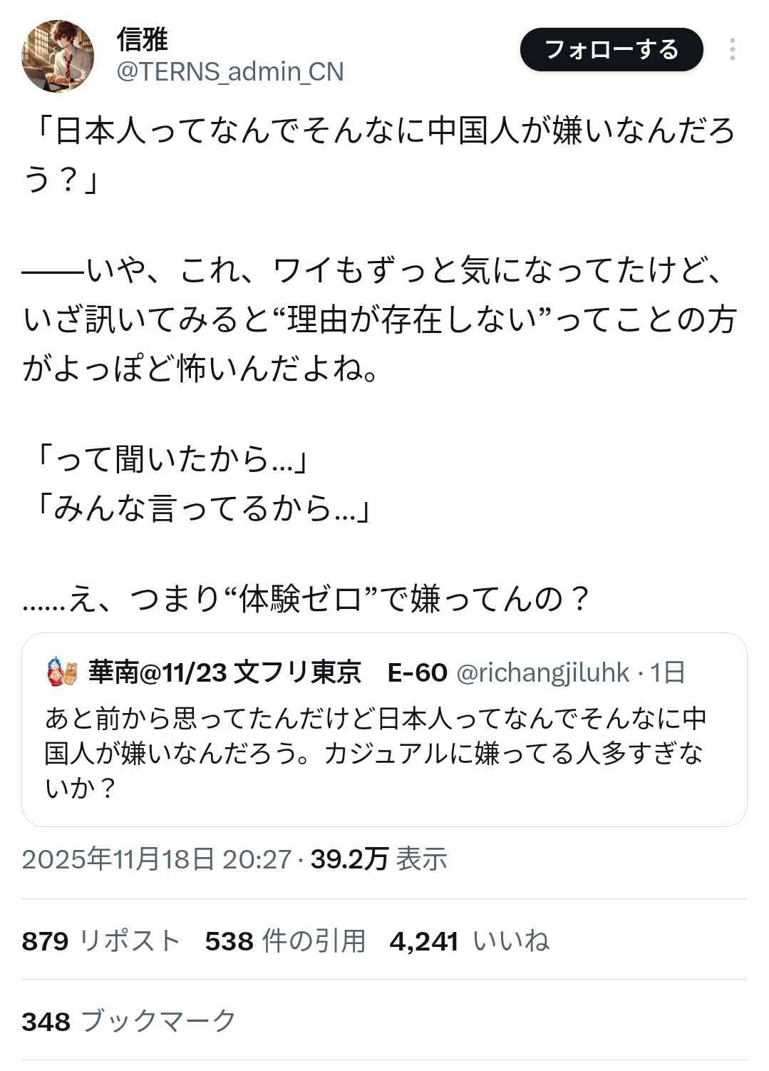 本当の中国人もこういう嫌われることしか言わんよな - 19 : 2025/11/19(水) 16:22:56.755 ID:Hz5h5Dn00