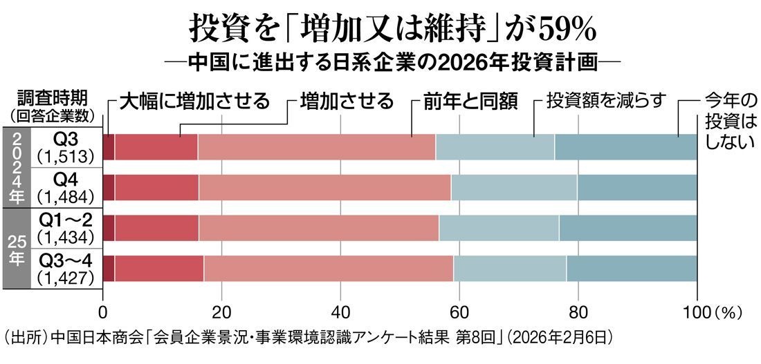 それによると、26年の中国投資について「増加又は維持」と回答した企業は59%に達した。