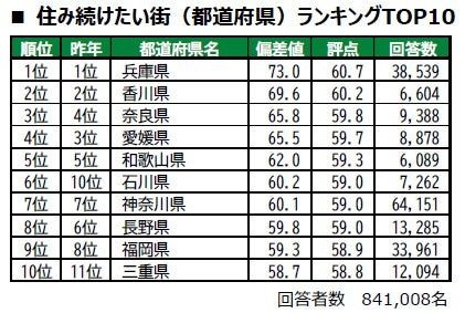 「住み続けたい街ランキング」では、兵庫県が堂々の1位にランクインしました。こちらも昨年から連続しての1位となります。
