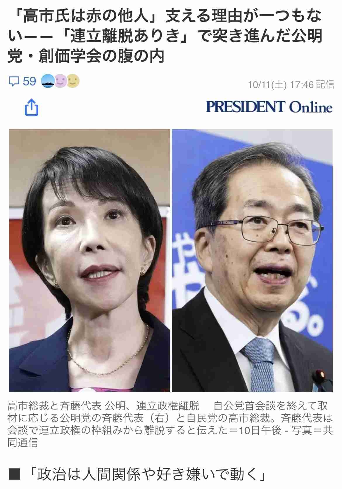 「高市氏は赤の他人」支える理由が一つもない──「連立離脱ありき」で突き進んだ公明党・創価学会の腹の内(プレジデントオンライン) - Yahoo!ニュース■「政治は人間関係や好き嫌いで動く」 自民党の権力闘争の火種が公明党・創価学会に飛び火し、炎上した。わずか6日後だった。どんでん返しの自民党総裁選が、公明党の連立政権離脱というちゃぶ台返しを呼びnews.yahoo.co.jp - 2 : 2025/10/11(土) 18:07:19.28 ID:O1iTWDFW0