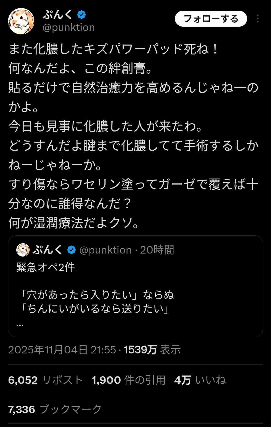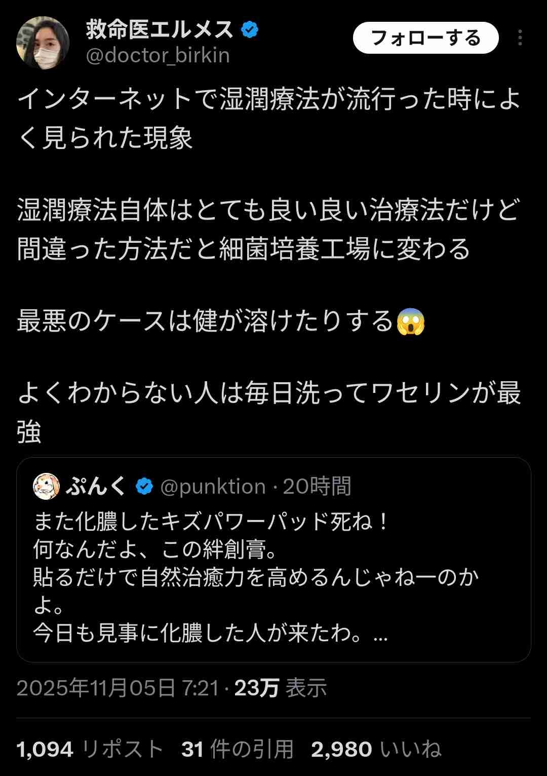 医者「キズパワーパッドはやめとけ!細菌培養工場だし化膿して壊死するぞ!」